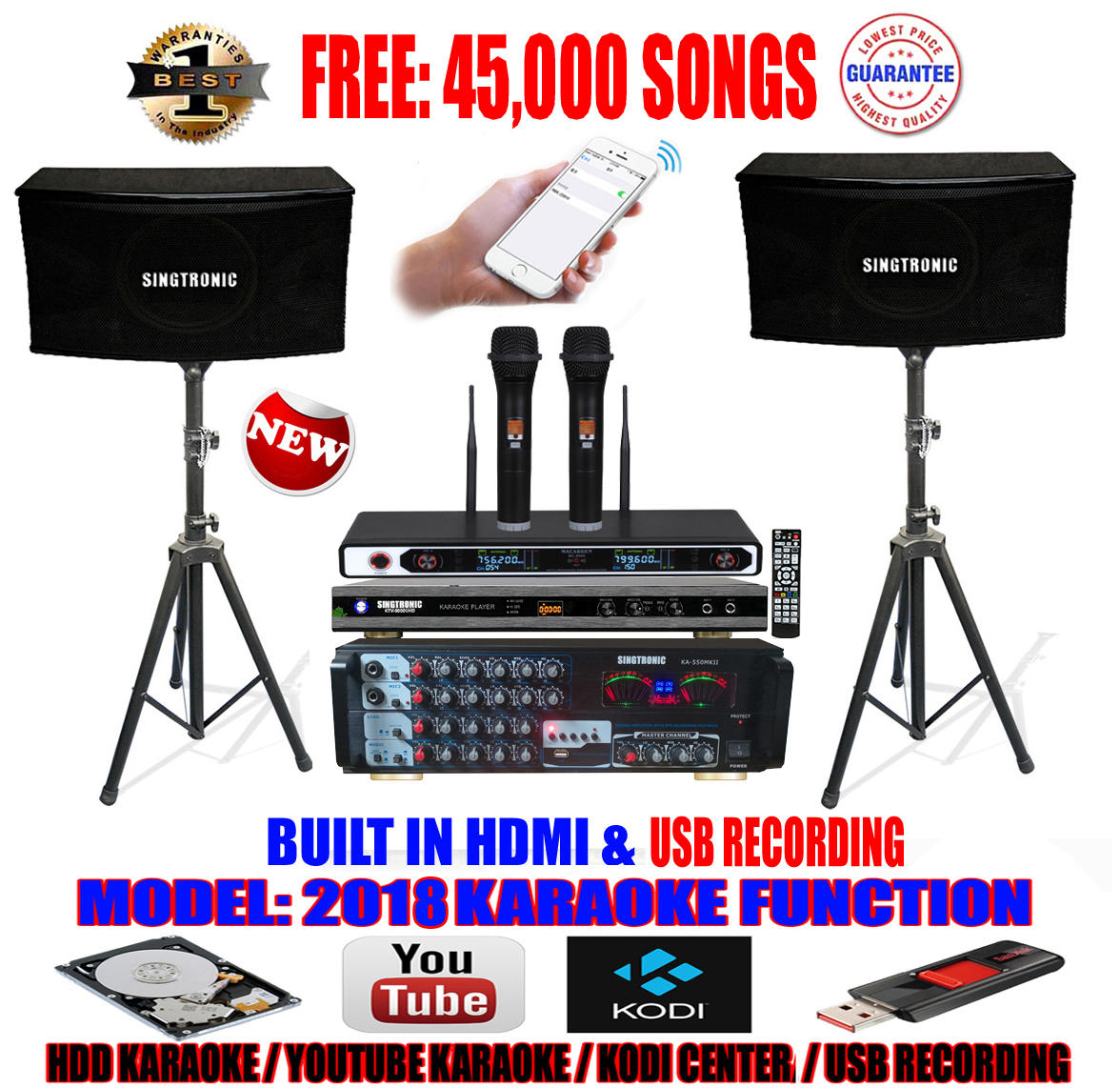 Professional SINGTRONIC Complete Karaoke Packages Special Include: 1. SINGTRONIC KA-550MKII PRO. 1000W MIXING AMPLIFIER KARAOKE ($599.00) 2. SINGTRONIC KS-550V KARAOKE 600W VOCALIST SPEAKERS ($499.00) 3. SINGTRONIC UHF-550M UHF PROFESSIONAL WIRELESS MIC. ($299.00) 4. SINGTRONIC KTV-9000UHD KARAOKE PLAYER 3TB HARD DRIVE ($499.00) 5. SINGTRONIC PROFESSIONAL HEAVY DUTY TRIPOD STAND ($99.00) IF YOU BUY SEPARATE ITEMS: $1999.00 *MANUFACTURER SUPER SALE 50% OFF, MUST BUY IT NOW: $999.00* COMPLETE OVER 45,000 Song Lists Pre-loaded in 3TB Hard Drive Click to view Latest Vietnamese Karaoke Songs Click to view Latest English Karaoke Songs Click to view Latest Spanish Karaoke Songs Click to view Latest Tagalog Karaoke Songs Special Features Newest Model: 2018 HDMI direct Output for both Super Digital Audio & (4K) UltraHD 1080P Video Dual On-Screen Navigation "Song Search" & "Lyrics Display" on the same TV screen Built in "Pure Auto Volume Control" means All the song are 100% at the same level Vocalist Control "Vocal Off" all songs are OFF & "Vocal On" all songs are ON. No need to keep pressing vocal button every song Direct Add New Song into the Hard Drive by PC or USB Flash Drive. Its so easy like 1,2,3..... Wifi & LAN Network to connect to Internet for Youtude KARAOKE and surfing net. Built in latest version: KODI, Vietmedia, Viet TV 24, watch live Sports, Movies, & TV Channel. Airplay Control and Select Song from HDD & Youtube Karaoke by Iphone, Ipad, Android, Tablet. FREE: UPS Ground Shipping Within 48 States.