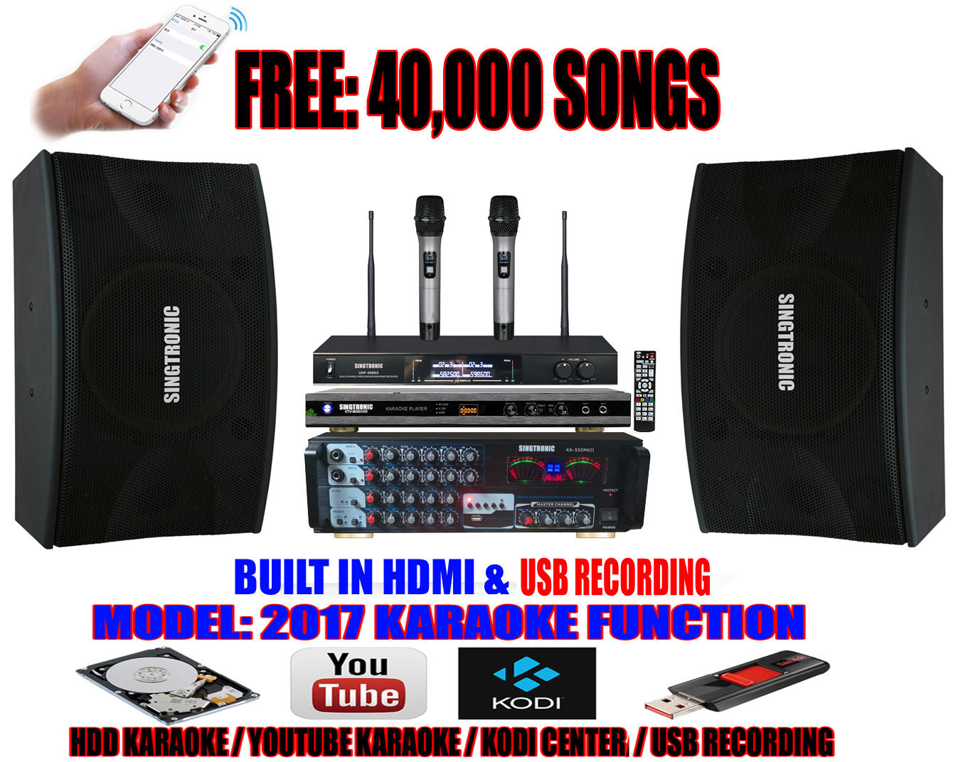 Professional SINGTRONIC Complete Karaoke Packages Special Include: 1. SINGTRONIC KA-550MKII PRO. 1000W MIXING AMPLIFIER KARAOKE ($599.00) 2. SINGTRONIC KS-550K KARAOKE 600W VOCALIST SPEAKERS ($499.00) 3. SINGTRONIC UHF-550MKII UHF PROFESSIONAL WIRELESS MIC. ($299.00) 4. SINGTRONIC KTV-9000UHD KARAOKE PLAYER 2TB HARD DRIVE ($499.00) IF YOU BUY SEPARATE ITEMS: $1799.00 *MANUFACTURER SUPER SALE 50% OFF, MUST BUY IT NOW: $849.00* COMPLETE OVER 40,000 Song Lists Pre-loaded in 2TB Hard Drive Click to view Latest Vietnamese Karaoke Songs Click to view Latest English Karaoke Songs Click to view Latest Spanish Karaoke Songs Click to view Latest Tagalog Karaoke Songs Special Features Newest Model: 2018 HDMI direct Output for both Super Digital Audio & (4K) UltraHD 1080P Video Dual On-Screen Navigation "Song Search" & "Lyrics Display" on the same TV screen Built in "Pure Auto Volume Control" means All the song are 100% at the same level Vocalist Control "Vocal Off" all songs are OFF & "Vocal On" all songs are ON. No need to keep pressing vocal button every song Direct Add New Song into the Hard Drive by PC or USB Flash Drive. Its so easy like 1,2,3..... Wifi & LAN Network to connect to Internet for Youtude KARAOKE and surfing net. Built in latest version: KODI, Vietmedia, Viet TV 24, watch live Sports, Movies, & TV Channel. Airplay Control and Select Song from HDD & Youtube Karaoke by Iphone, Ipad, Android, Tablet. FREE: UPS Ground Shipping Within 48 States.